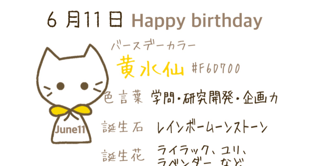 6月11日って何の日?について。 記念日と誕生石や誕生花! この日に生まれた有名人を3分で紹介していきます! もくじ1 6月11日生まれの有名人2 6月11日の記念日3 6月11日の誕生石46月11日の誕生石&生まれの仕事運 豊かな才能と優れた知性を備えた生まれです。 幅広い仕事で実力を発揮する事ができるでしょう。 鋭い直観力と対人能力を備えた生まれのため、 販売員・公務員・社会福祉士・法律家 など幅広い仕事で才能を活かす事ができます。 人を癒す能力を秘めているため、カウンセラーやセラピストなどの仕事も良いでしょう。 生来6月11日の誕生石・石言葉 誕生石 石言葉 ホワイト・ラブラドライト 良い噂 6月11日の誕生花・花言葉 誕生花 花言葉 ヒゲナデシコ 伊達男 6月11日の誕生色・色言葉 誕生色 色言葉 黄水仙 学問・研究開発・企画力 6月11日の誕生星・星言葉 誕生星 星言葉 カペラCapella ぎょしゃ座α星